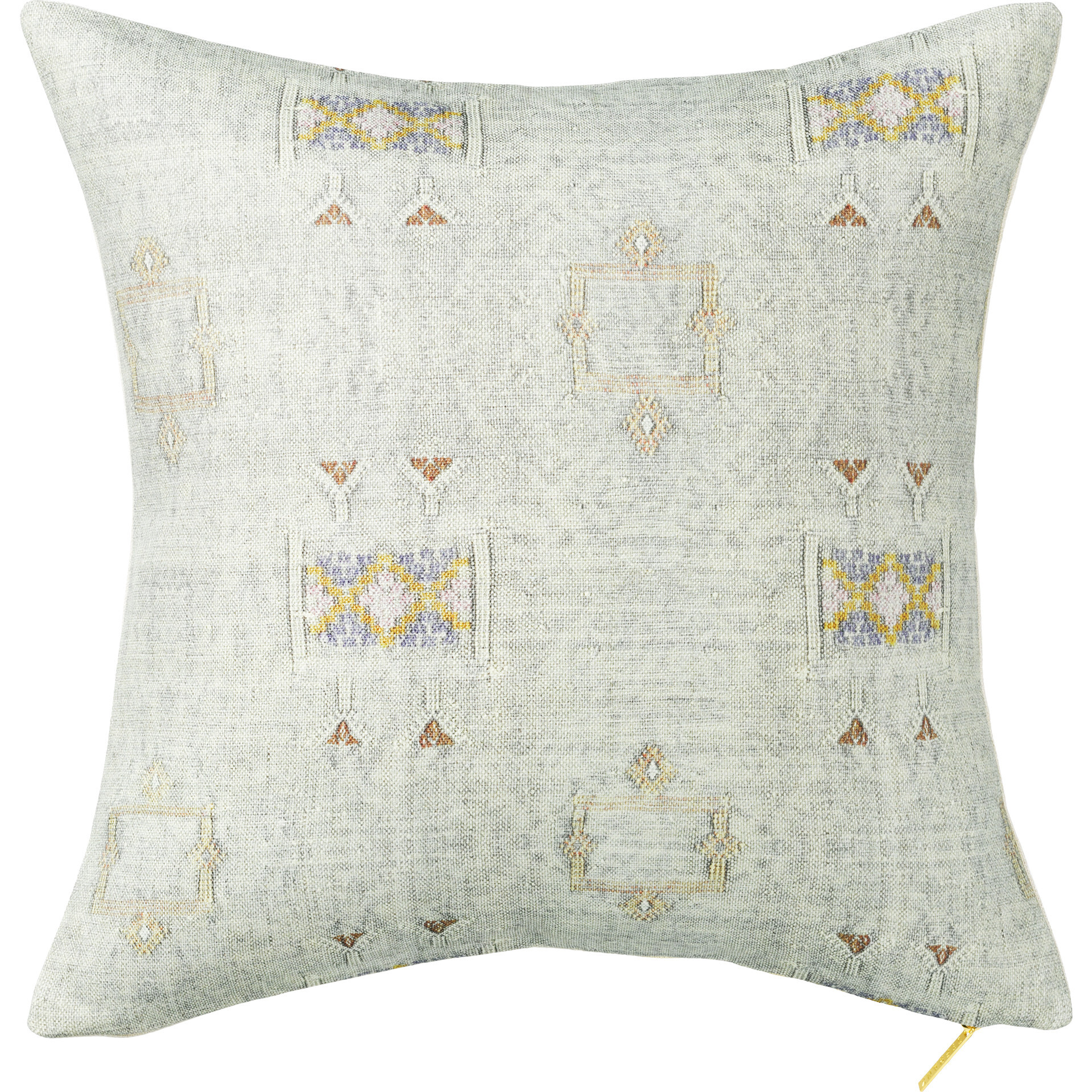Measuring 22" x 22", this pillow is crafted from Sabra cactus silk, finished with flax linen backing and closed by an exposed zipper with a gold pull. The cushion is stuffed with an oversized down insert. This pillow is made from fabric inspired by our vintage Cactus Silk textiles, created by Berber people, indigenous to North Africa. Berber textiles can be identified by region and tribe, detailed with stripes and symbols. The small symbols seen here mimic traditional tattoos that adorn Berber women. The symbols have many meanings, such as longevity, fertility, protection against the evil eye, cures for illnesses, tribal association, and marital status.