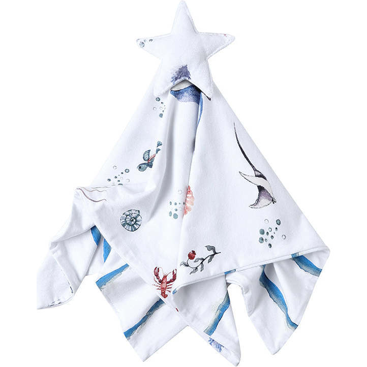 What is a lovey? Any calming object a child attaches to, but the most common kind of baby lovey is a small, soft piece of fabric - a mini blanket if you will that soothes a child and makes them feel safe and secure. Since you will see this lovey ALL the time we figured it would be nice to make them extra buttery soft, super chic and reversible! The Under the Sea Print is inspired by the gorgeous Sardinian Sea. Key features: Made of safely sourced bamboo cotton reversible blanket + soft star head made with polyester filling Free of harmful chemicals, like flame retardants, PFAS and antibacterial agents 16" x 16" the perfect size to go from baby to toddler bedtime routines Suitable for extra sensitive skinensitive skin.