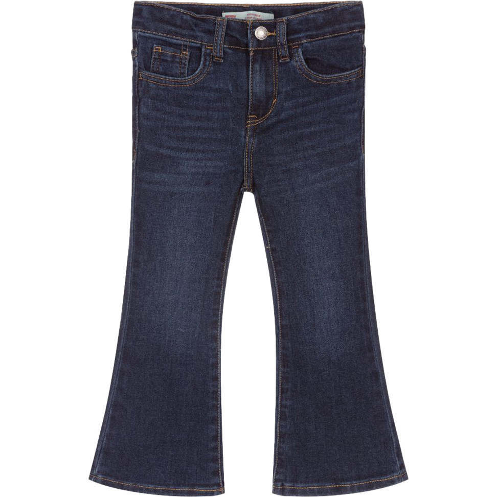 Navy high rise denim jeans for kid girls by American brand Levi's Kidswear, with a cropped, flared style. Made in stretchy cotton denim, they have a washed and worn look. The useful adjustable waistband has a 2-Horse logo badge around the back and one of the back pockets has the designer's iconic Red Tab logo tab.