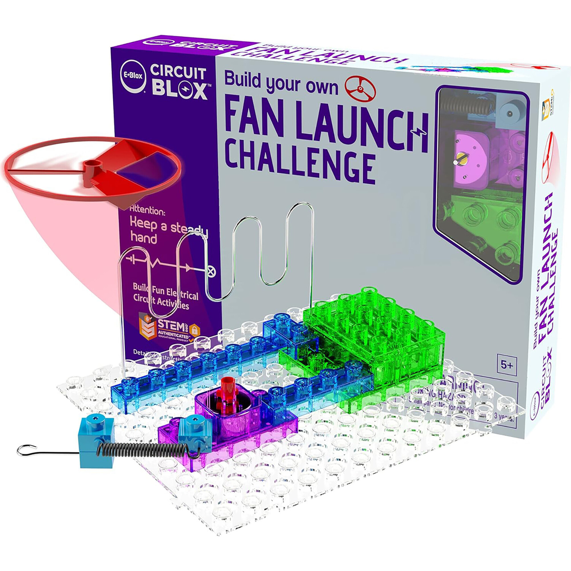 E-BLOX BUILD YOUR OWN FAN LAUNCH CHALLENGE BUILDING BLOCKS KIT - Do you have a steady hand? Test your nerves with our Build Your Own Fan Launch Challenge Kit. Move a hook through a wavy wire maze. Don’t let the hook touch the maze for too long, or else, the fan will spin and launch high into the air! Whoever gets from one side of the maze to the other with the fewest number of fan launches is the winner. The steadiest hand wins! The colorful blocks have electronic components that allow children to discover how circuits work while also creating friendly competition. Compatible with our Circuit Blox and Power Blox lines, LEGO, and other major brick brands. Designed to stimulate creativity and teach kids to investigate the world through creative reasoning and the systematic building of objects. Kids will get to innovate as they plug together bricks and modules to create their own toys and games. The E-Blox Build Your Own Fan Launch Challenge Kit is suitable for children ages 5 and up. Manual included to guide your children in building their own masterpieces safely. Requires three AA batteries (not included). THE KIT PROVIDES hours of fun and educational play. The colorful building blocks contain electronic components such as a battery module, switch, motor and maze module. Build your own fan launch challenge and test your steady hand to see if you can get through the maze without launching the fan!