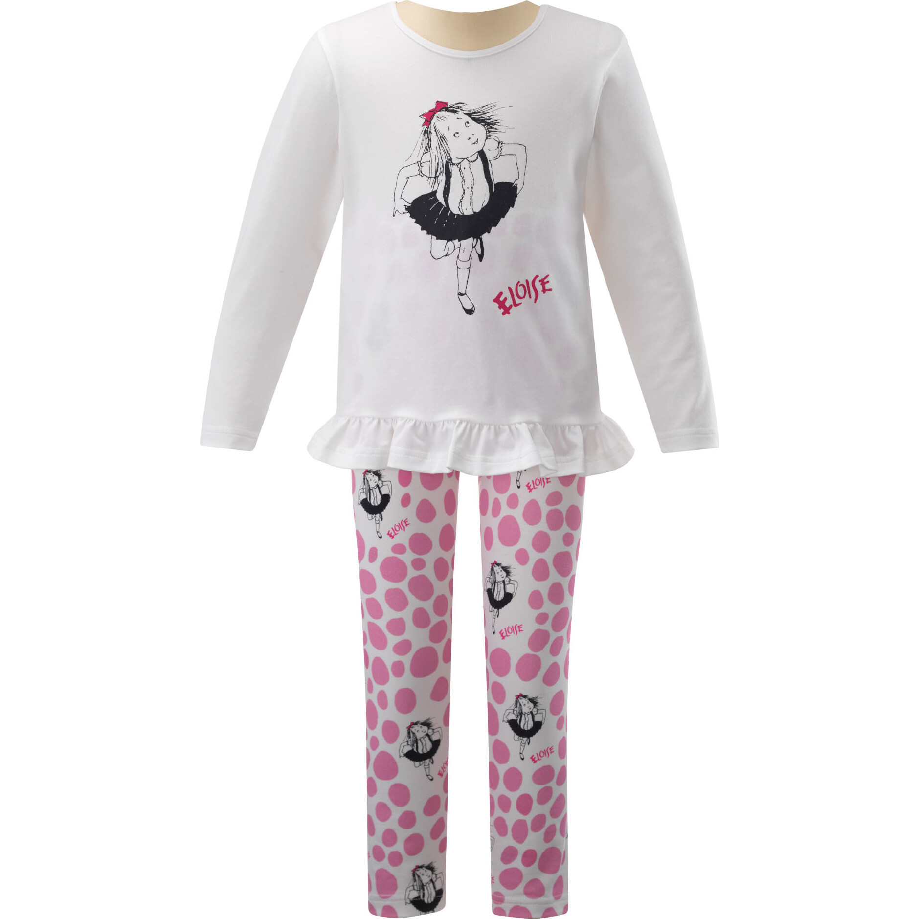 Your little one will love this playful Eloise Polka Dot Jersey Legging Set, featuring whimsical illustrations by Hilary Knight from Kay Thompson's Eloise. With a design inspired by Eloise’s adventures, this casual 2-piece set includes a long sleeve frill top and matching leggings with an Eloise inspired polka dot print. Whether it’s for play days indoors or as cozy loungewear, this set offers comfort, style, and a dash of Eloise flair. Perfect for twirling, scamping, and skibblingjust like Eloise! Based on the book, Eloise, written by Kay Thompson, illustrated by Hilary Knight, and published by Simon & Schuster. Copyright 2023 Eloise Enterprises LLC. All rights reserved.