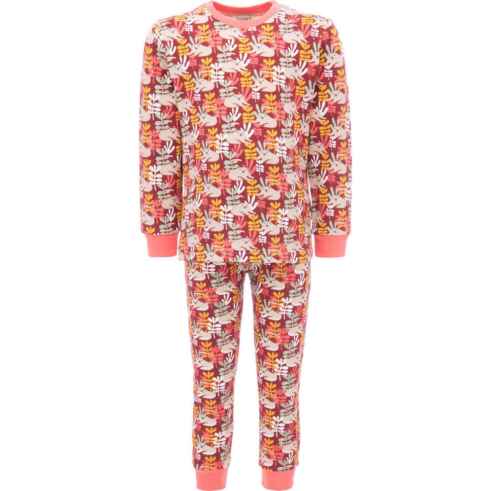 Orange forest leopard print PJ set for kid girls from BANBLU, featuring a long sleeve orange PJ top with an all over leopard in a forest print with orange cuffed sleeves and matching pants.