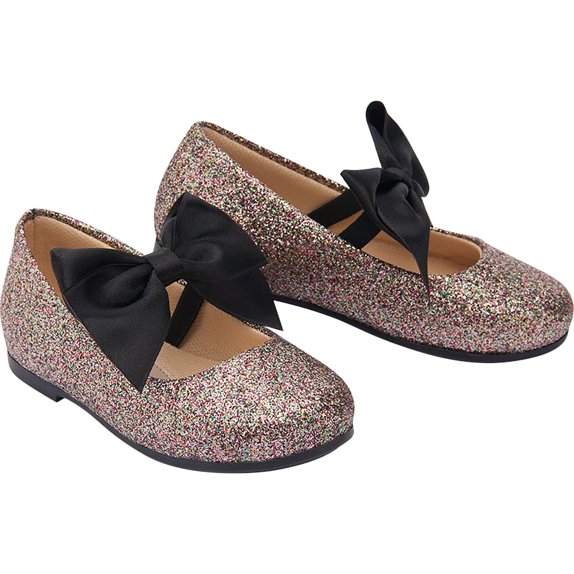 Fun, glittery, multicolor elastic bow flats designed by Perla for toddler and kid girls. Features elastic band strap for a simple, snug fit with a black bow on the elastic and covered in glitter for a bold look to add to any outfit.