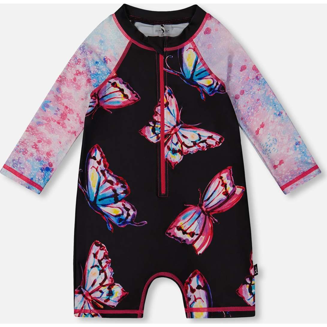 Long Sleeve One-Piece Rashguard, Black And Multicolored Butterflies