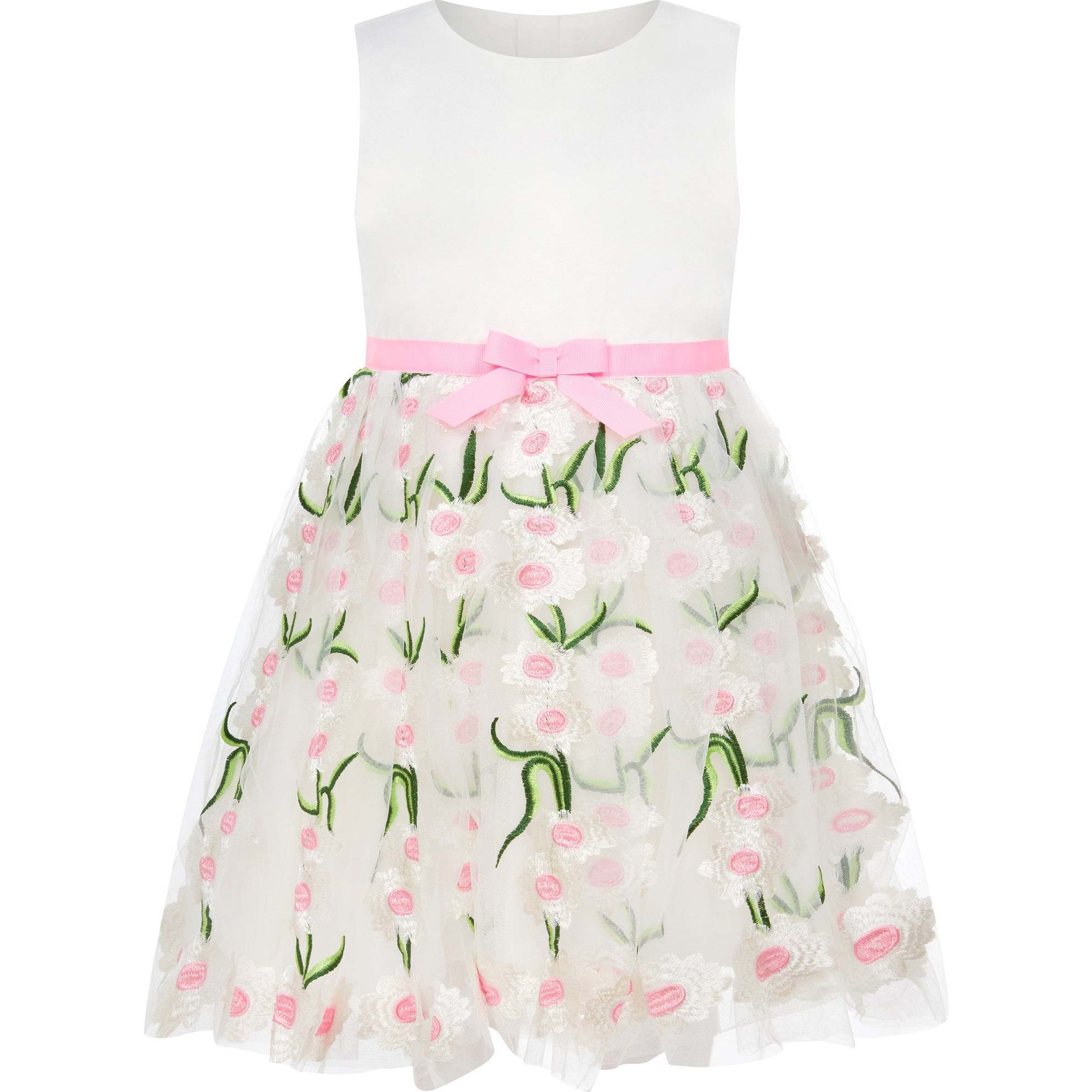 A beautiful daisy embroidered dress on soft white tulle, sleeveless with a floaty skirt and a pretty pink bow belt detail. The dress is knee length, fully lined in soft fabric, with an easy zip back fastening. Perfect for parties, Easter, Flower Girls and special occasions. An original British classic, designed exclusively by Holly Hastie, perfect for every occasion and celebration.