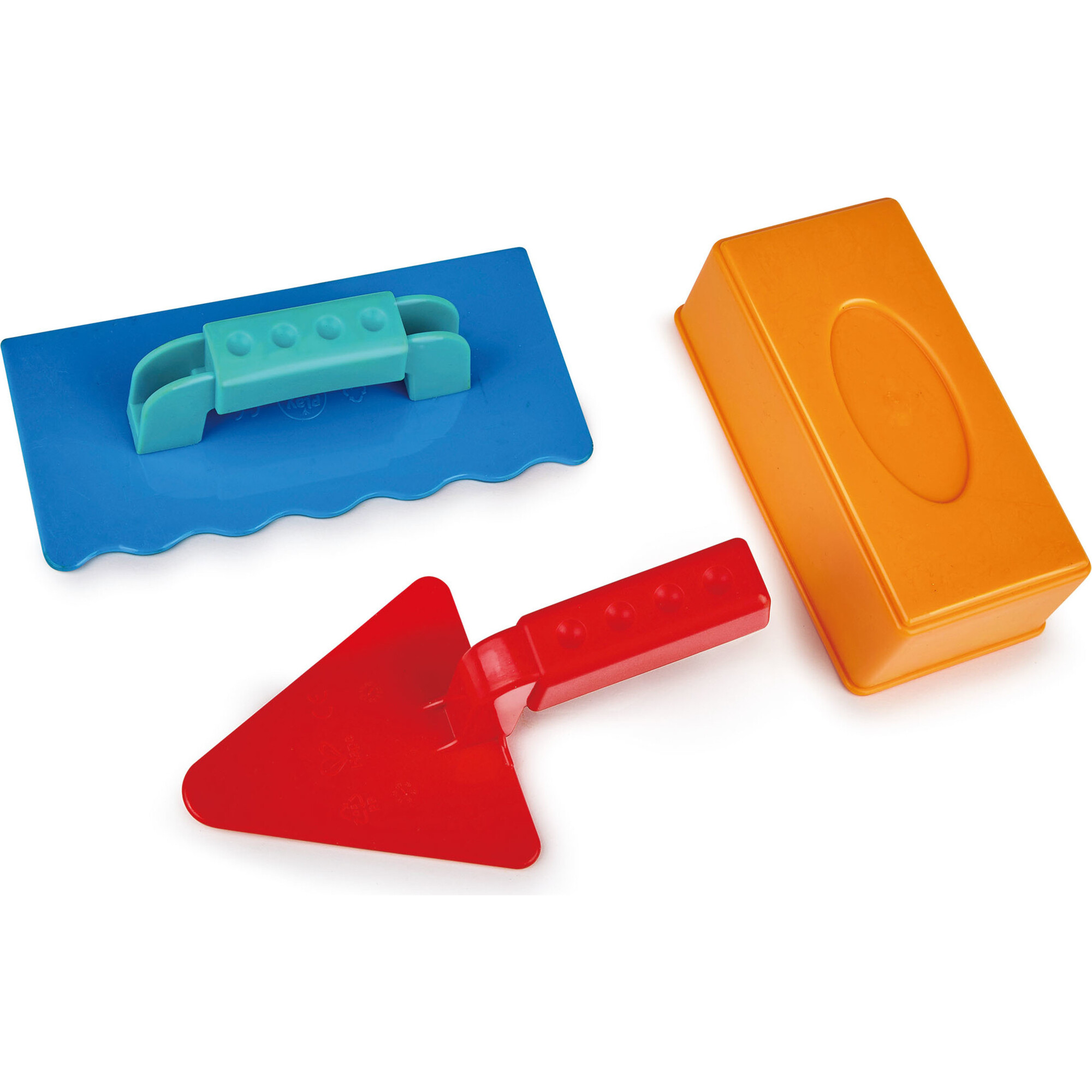 MASTER BRICKLAYER SET - Build an amazing castle in the sand. One brick at a time. Add water to the sand to make it easy to mold. Add other play props such as cups, shells, sticks, gardening tools, utensils, and vehicles. The Hape Master Bricklayer set is the perfect tool kit for kids who love to play in the sand. This set features three pieces to help you make the perfect bricks: a brick mold, a smoother tool, and a shaper tool. Each piece is brightly colored and made from durable HDPE and ABS plastics. Build a giant sand castle with a moat, or use your tools to sift through the sand for shells! Encourages creative play, healthy outdoor activity, and the development of fine motor skills. Durable child-safe paint finish and solid construction make this a set your child will love for years to come. THE HAPE PROMISE: Hape toys stimulate children through every stage of development and help nurture and develop their natural abilities. All Hape products sold in North America meet or exceed all applicable safety standards. Our toys are created to inspire play, learning, and exploration of the world we live in; through responsible business practices, we aspire to leave the world in a better condition than when we received it.