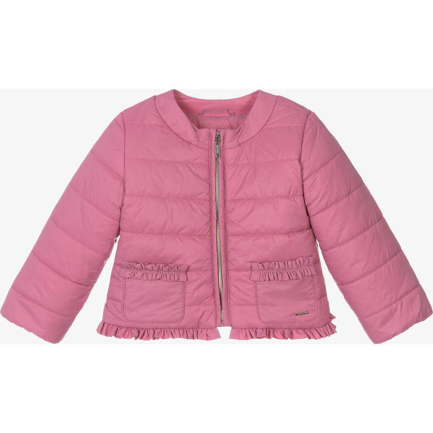 Pink padded ruffle windbreaker for baby girls from Mayoral. Round neck, zip closure, dual pockets with ruffle hem.