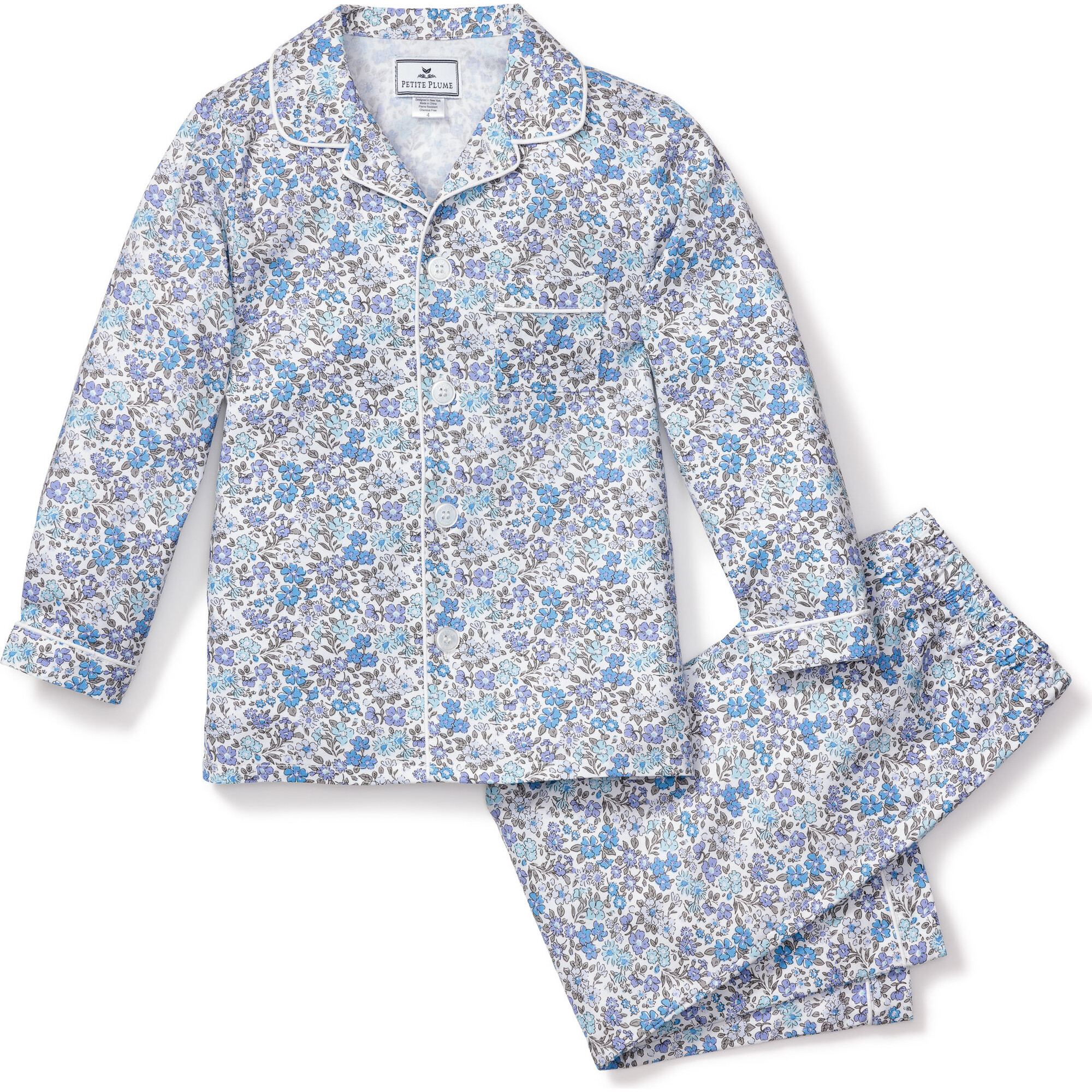 A vintage-inspired print of petite blue flowers as you could imagine climbing the vine of an old stone house in the Cote d’Azur. Periwinkle, pale aqua, heather gray and a soft lavender. This classic pajama set is accented with piping and finished with pearl buttons. The sleepwear is made from the finest quality cotton and blended with just enough inherently flame retardant fiber to allow it to pass strict CPSC flame retardant laws without using harmful chemicals. The fabric is brushed for added softness, making the sleepwear feel absolutely luxurious, getting cozier after each wash.