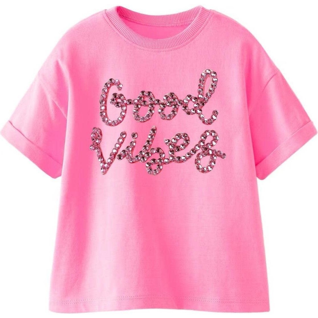 Spread positivity with this vibrant pink T-shirt featuring a sparkling "Good Vibes" crystal design. Oversized fit with rolled sleeves, perfect for a relaxed, stylish look. Made from soft, breathable fabric that combines comfort and flair for everyday wear. Material and Care: Crafted from premium cotton with crystal embellishments. Care Instructions: Hand wash recommended; lay flat to dry to preserve the crystals and fabric quality.