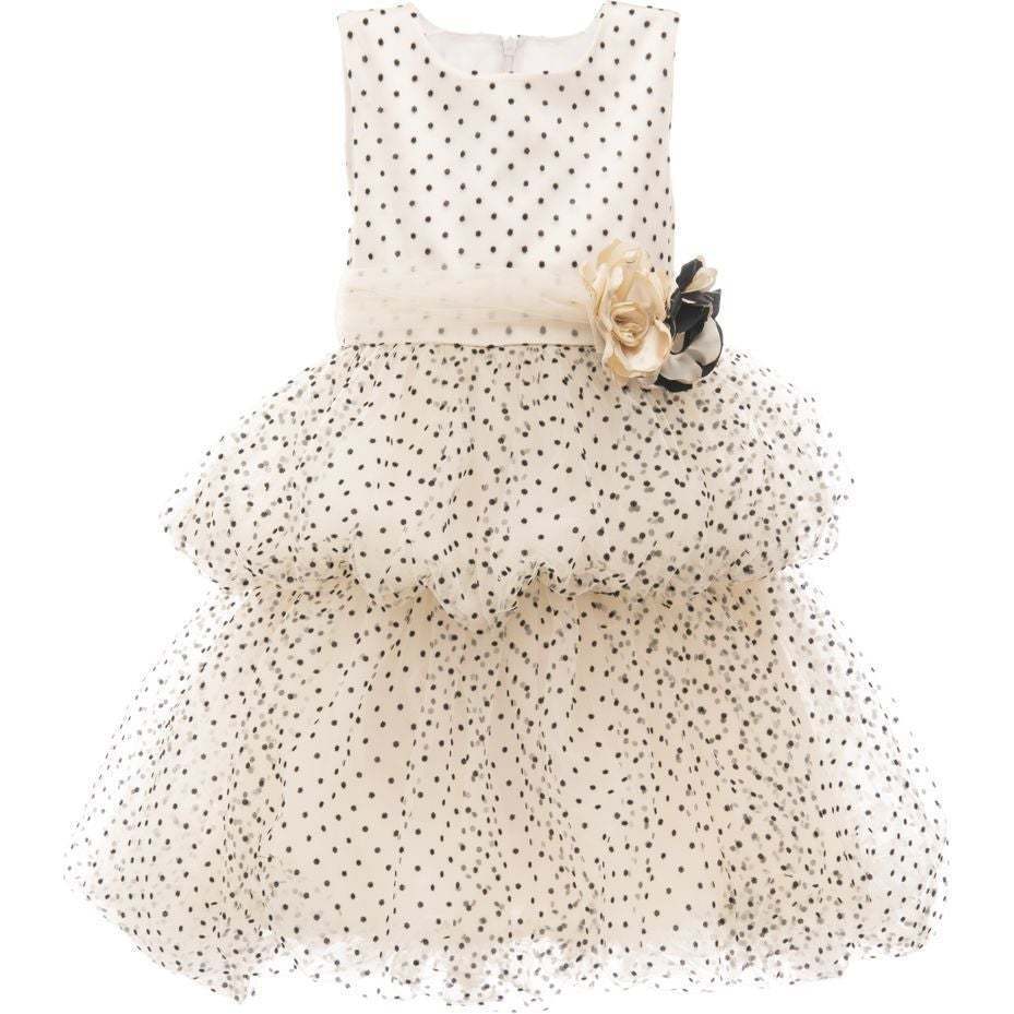 This gold bodice polka dot dress is simply precious, featuring a satin belt adorned with a beautiful cream rose assortment adjacent to the belt, leading to a layered continuation of the polka dot pattern into the tulle to create the perfect princess silhouette.