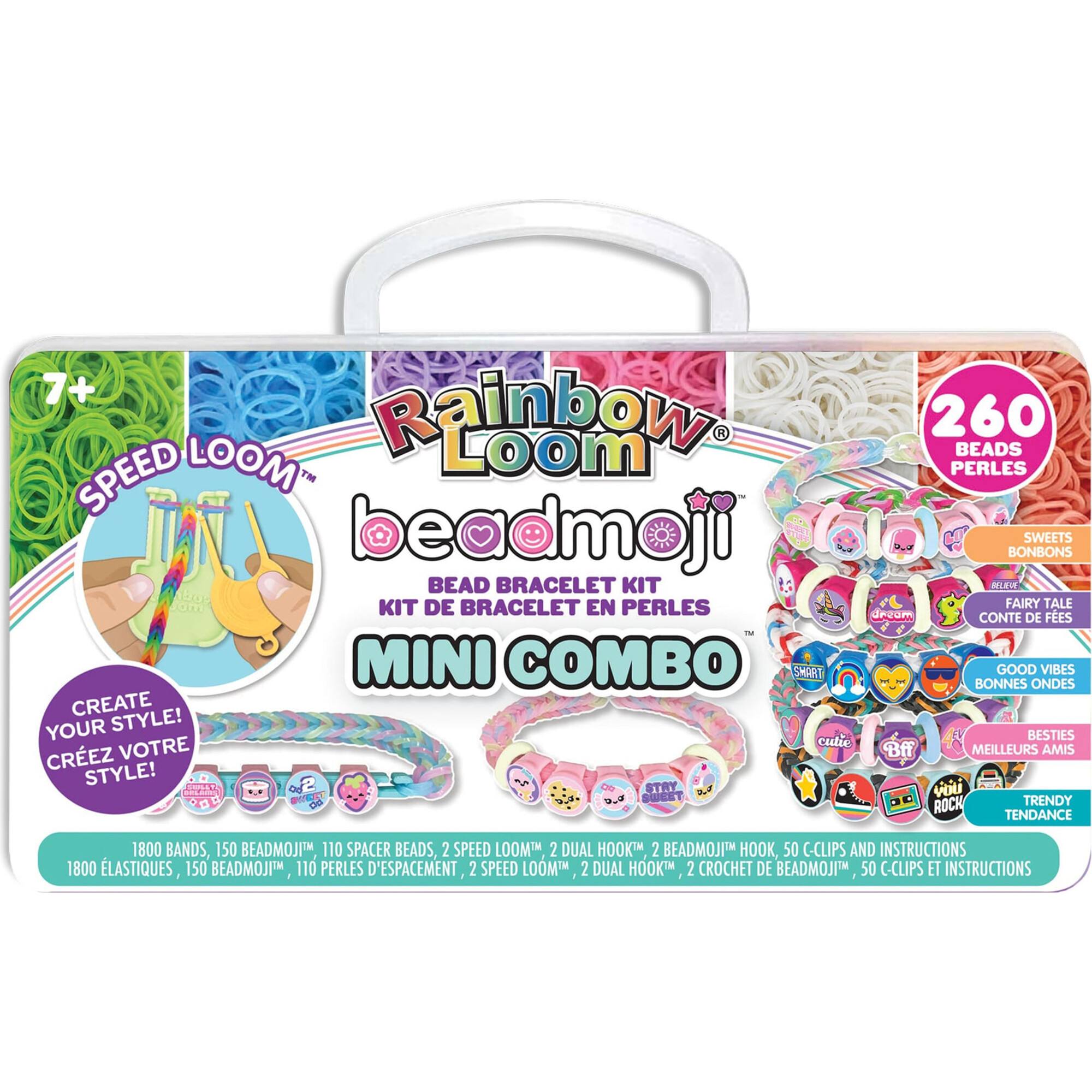 BEADMOJI: MINI COMBO - Beadmoji are unique beads that feature fun messaging and icons that allow you to decorate your rubber band jewelry with a wide variety of trendy themes. Beadmoji features our new speed loom and dual hook allowing you to create rubber band bracelets twice as fast. Create your own style by mixing and matching your rubber bands with 150 beads to chose from! Beads come in these popular kid-friendly themes: Sweets, Fairy Tale, Good Vibes, Besties, and Trendy. Use these cute beads to create hundreds of customizable bracelets to keep and wear or share with friends and family! Easy to use and includes all tools to add the beads to your bracelets. All authentic Rainbow Loom products meet US Toy Safety Standards for being Phthalates-free, Lead-free, Cadmium-free, Chromium-free, Mercury-free, and Arsenic-free! KIT INCLUDES: 1800 Bands, 150 Beadmoji Beads, 110 Spacers, 2 Beadmoji Hooks, 2 Speed Looms, 2 Dual Hooks, 50 C-Clips and easy to follow instructions recommended for ages 7 and up. RAINBOW LOOM: Beadmoji is created by the award winning Rainbow Loom! Craft products are ideal for developing fine motor skills and cognitive thinking. Inspiring kids to spread kindness through creativity and sharing.