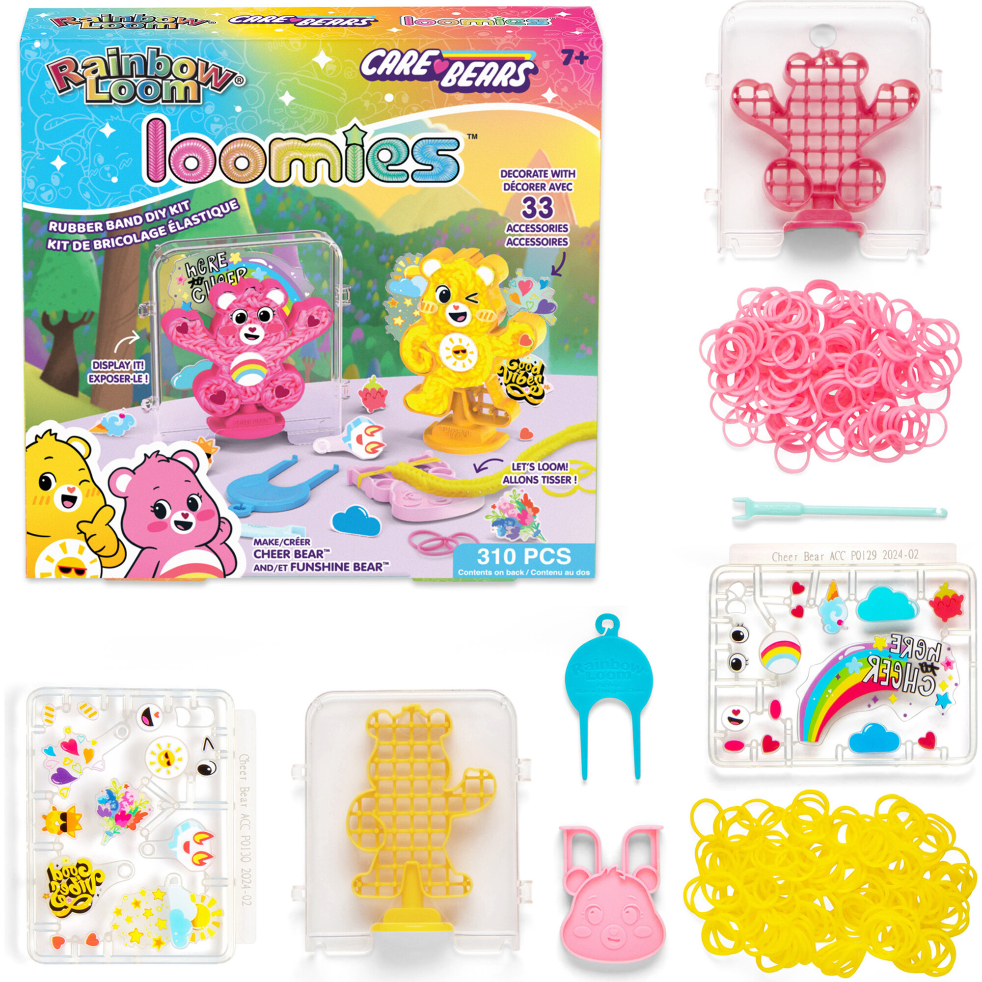 RAINBOW LOOM CARE BEARS LOOMIES CHEER BEAR & FUNSHINE BEAR - Care Bears and Rainbow Loom have teamed up to present an enchanting line of products. Create delightful designs featuring your favorite Care Bears characters on your favorite Rainbow Loom products! Includes exclusive easy-to-use Cheer Bear Happy Loom. The stands and showcases make it easy to display your creations, take them with you, or play with them anywhere. The accessory frames keep everything in one place and allow you to customize your character to your heart's desire. Great gift for ages 7 and up that promotes fine motor skills and cognitive thinking while building confidence in creative skills. Easy to learn for kids and adults to make, share, and trade creations with friends and family. Let your imagination soar and spread the message of sharing and caring through your creations. Officially Licensed Care Bears DIY Jewelry Kit.