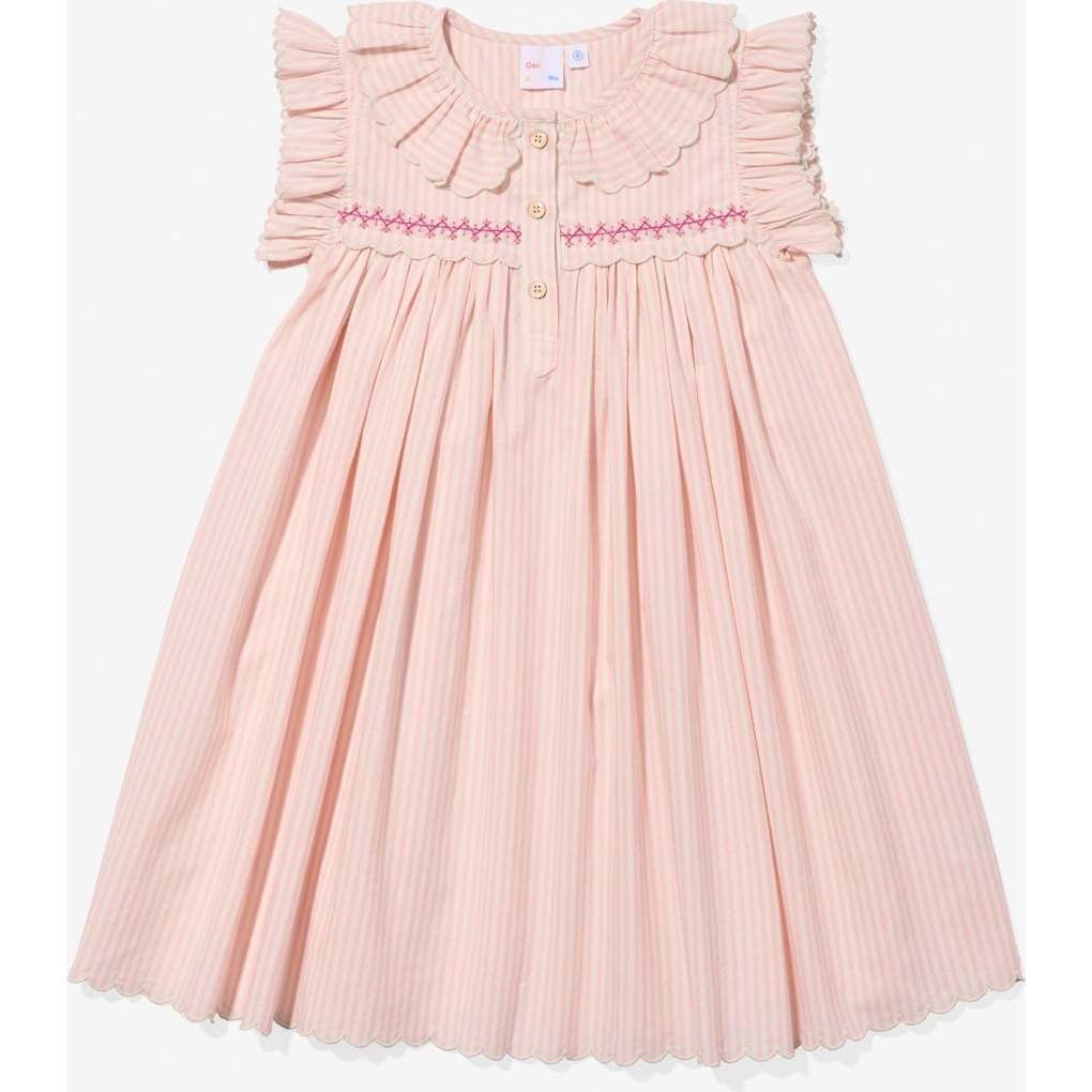 This darling party dress has all the bells and whistles. Beautifully scalloped ruffles along the sleeves and collared neckline mixed with embroidery make for the perfect special occasion dress. It comes with a set of matching ruffled bloomers up to size 5 for the sweetest party look.
