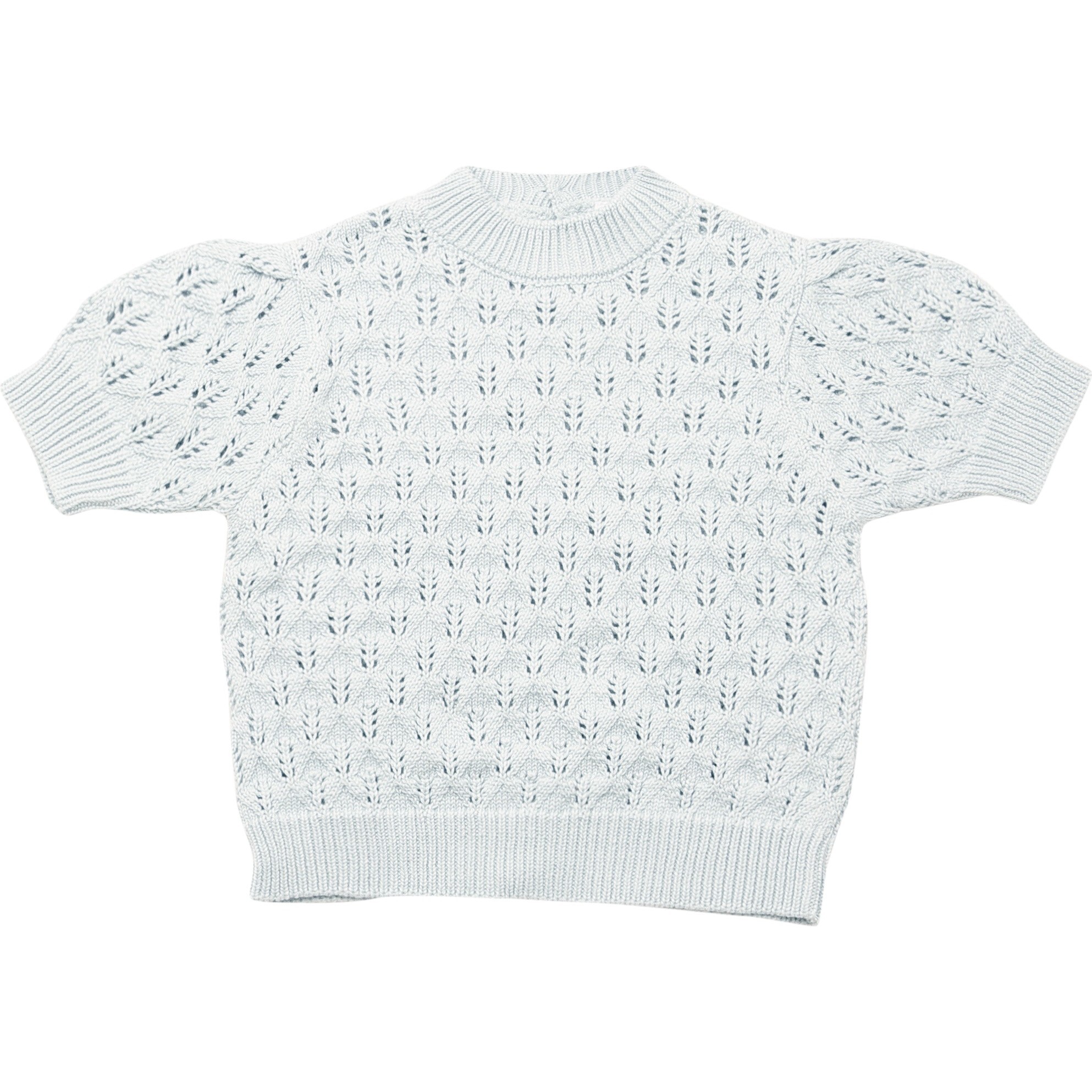 Short puff sleeved jumper with gathering on the shoulders and a T-shirt shape. Knit is a small detailed openwork texture and is contrasted with ribbed cuffs, neck and hem. Made from powder blue organic cotton yarn, a perfect shade to match & layer with the collection.