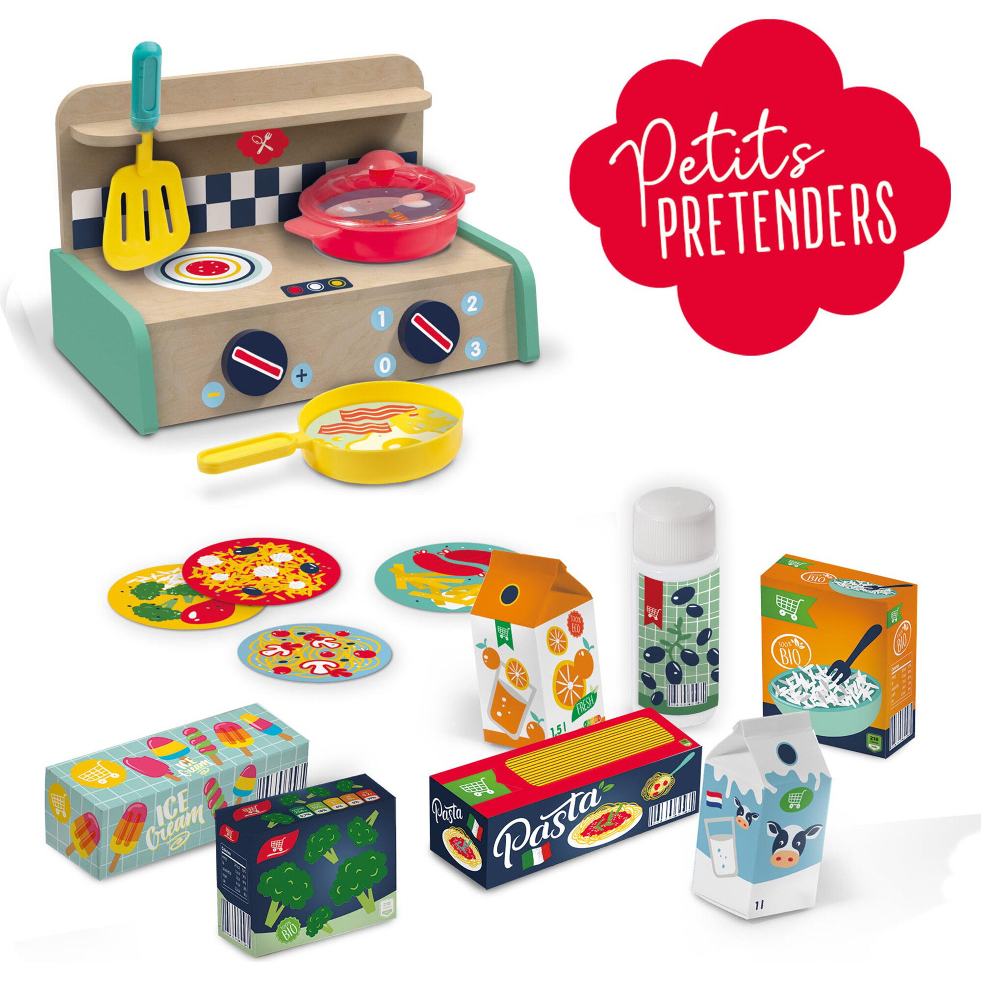 SES CREATIVE KITCHEN PLAY SET - REAL WOOD KITCHEN - 16 PIECE TOY SET. Do you love to cook? Do you want to help out in the kitchen at home or even start your own restaurant? Then this play set from the Petits Pretenders line by SES with a wooden kitchen is just for you! This set includes everything you need to become a true kitchen prince or princess. With a wooden kitchen, frying pan, cooking pot, spatula, bottle of oil, and six grocery items, you're all set. It even comes with fun dishes to "cook" in the pan. What's your favorite dish to make? Plus, it pairs perfectly with other store and cooking products from the Petits Pretenders collection. With this set, you get a beautifully designed wooden kitchen that's trendy and fits right into any home. It sparks imagination and creativity through play, providing everything you need for hours of fun as a little chef. Cook up your favorite meals with the printed food items and enjoy serving your culinary creations. You'll find a wooden kitchen, frying pan, pan with lid, spatula, printed dishes, seven packs of supermarket products, stickers, and instructions. The kitchen’s real wood build and stylish design make it a great addition to any playroom or living space. Get ready for endless adventures as a chef! This set not only looks great but also offers endless opportunities for imaginative play. Combine it with other items from the Petits Pretenders line and create your very own kitchen kingdom. Dive into the world of cooking and let your culinary dreams come true! INCLUDES: Wooden kitchen, Frying pan, Pan with lid, Spatula, Printed dishes, 7 packs of supermarket products, Stickers, Instructions.