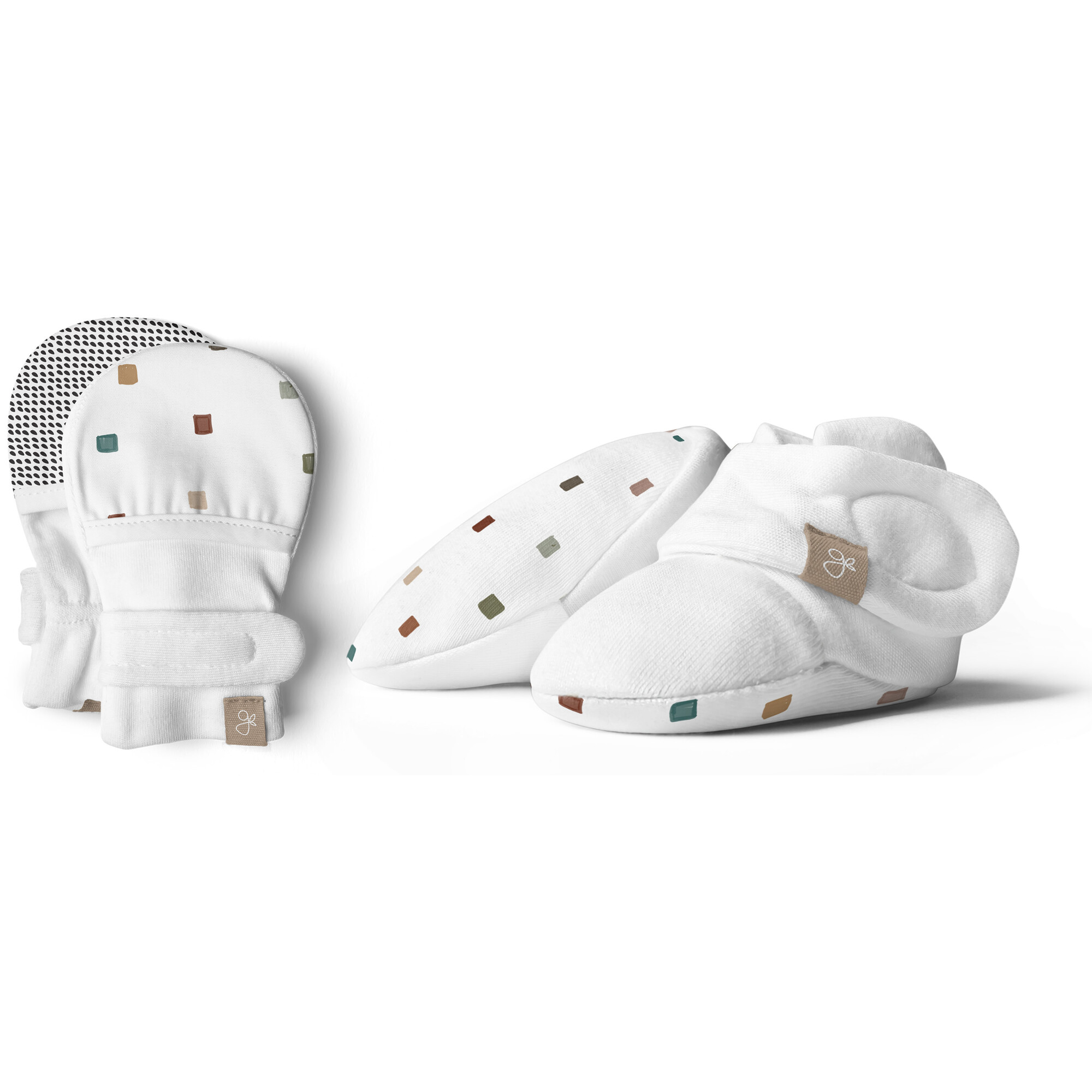 A super-soft baby boot and mitt duo that are adjustable and stay on, no matter what! Signature two-part closure keeps mitts and boots on and adjusts as baby grows. Has a reversible black and white patterned side that can be flipped and doubles as a developmental aid + keeps baby calm. Luxuriously soft & built for hand me downs.