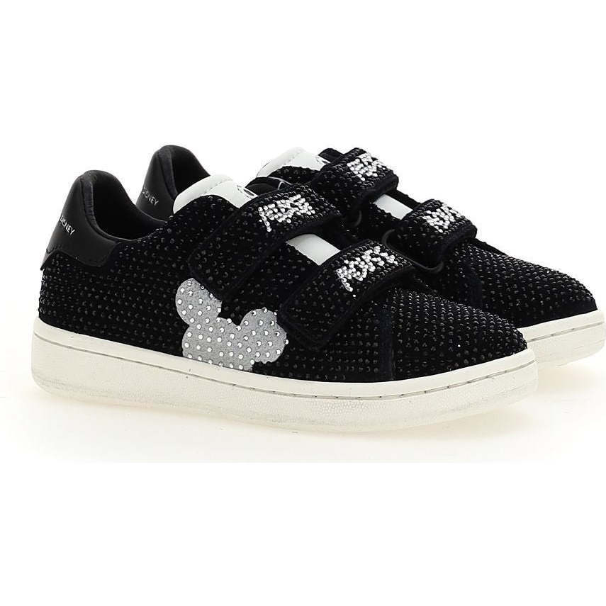 Black studded mickey velcro sneakers for kid and baby boys by Master of Arts. Synthetic lining. Rubber soles. Soft upper. Low necklines. Ankle pads. Strengthening patches on the heels. Non-slip soles.