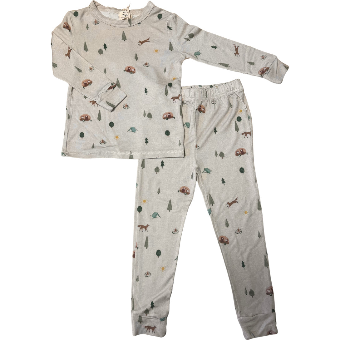 The softest and most heavenly pajamas, made in buttery soft, luxurious Modal fabric with a touch of elastane for stretch. Our fun camping print is hand-drawn and features foxes, tents, campfires, trees, and campers. Also available as footy pajamas in sizes Newborn through 12-18m for sibling matching. 95% Modal, 5% elastane Made with love in Portugal Care: Wash on a cold, delicate cycle. To prevent pilling and to keep your pajamas feeling like brand new we recommend hanging or laying flat to dry.