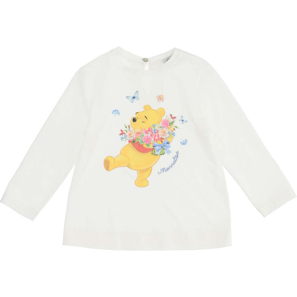 Ivory top for little girls by Monnalisa, made in soft and stretchy cotton jersey. It has a cute Disney Winnie the Pooh and floral print on the front, with a blue embroidered logo.