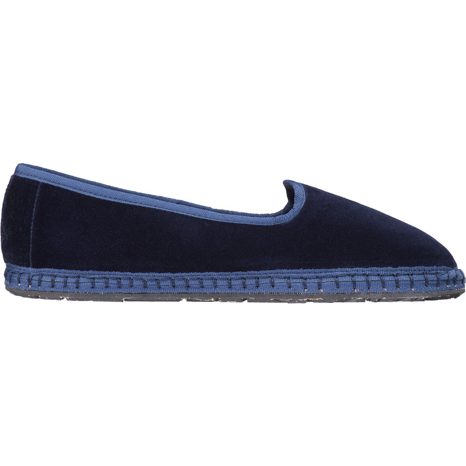 Velvet slipper in dark blue with dark blue piping and buckle closure. The outside of the shoe is 100% cotton velvet, and the inside of the shoe is 100% ecological cotton with anti-bacterial treatment. The sole is made of rubber produced from recycled bicycle tyres.