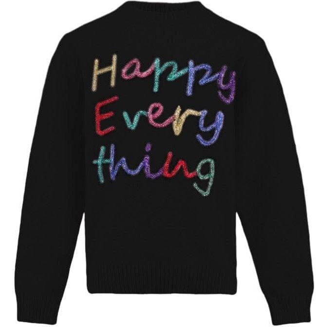 Cheerful sweater featuring a "Happy Everything" slogan adorned with colorful tinsel detailing, perfect for adding a festive touch to your wardrobe. Designed with a cozy and soft knit fabric to keep you warm and comfortable during cooler seasons. Classic crew neck style with ribbed cuffs and hem for a snug and stylish fit, suitable for various occasions. Material & Care: Material: High-quality acrylic knit with vibrant tinsel accents. Care Instructions: Hand wash cold separately. Lay flat to dry. Avoid bleaching and ironing directly on the tinsel to maintain its sparkle and quality. Handle with care to preserve the cheerful design.